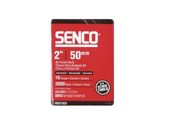 Los clavos Senco de 2 pulgadas y calibre 16 vienen en una caja de 2000 piezas con el código M001005. Son ideales para una variedad de proyectos de construcción y ebanistería, ofreciendo resistencia y durabilidad excepcionales.