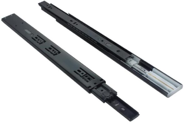 Esta corredera negra de extensión completa de 18 pulgadas con cierre suave ofrece un deslizamiento suave y silencioso para gavetas y bandejas. El mecanismo de cierre suave asegura que los gavetas se cierren de manera controlada y sin golpes.