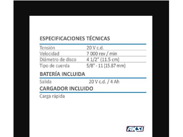 Grinder inalámbrico 4-1/2 in 20V – 4 Ah línea Switch AKSI + batería + cargador rapido – 196031