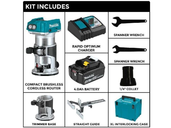 Juego Inicial de Router Compacto Inalámbrico LXT® Litio-Ion de 18V sin Escobillas (4.0Ah) Makita – XTR01M8J