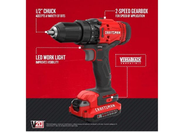 Kit de taladro/destornillador inalámbrico Craftsman V20, 1/2 in, batería y cargador incluidos – CMCD700C1