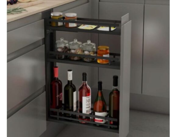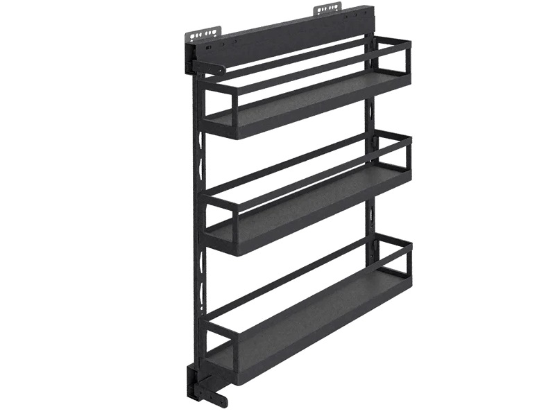 Este módulo extraíble de tres niveles en color gris antracita ofrece una solución eficiente para organizar tus utensilios de cocina. Las correderas de cierre lento garantizan un funcionamiento suave y seguro. Con dimensiones de 4-5/16 x 18-1/2 x 21-7/16 pulgadas, se adapta a diversos espacios de almacenamiento en la cocina.